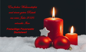 Die Freiwillige Feuerwehr Dortelweil wünscht Ihnen und Ihren Familien ein fröhliches Weihnachtsfest und ein erfolgversprechendes und vor allem gesundes und friedliches neues Jahr.